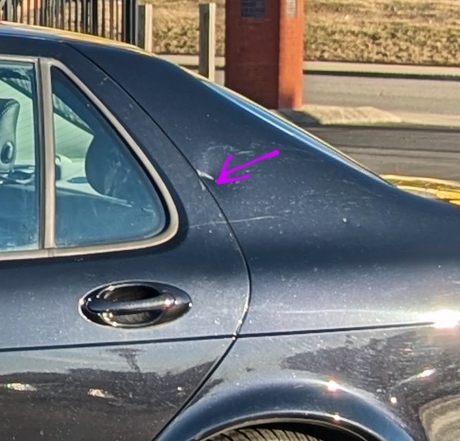 slight crease in rear passenger door-- Car came with it when I bought it.